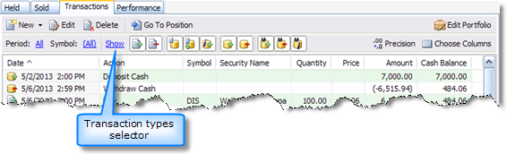 By default, the Transactions view displays all transactions that have occurred in a portfolio. You can filter the transactions list by limiting them to: